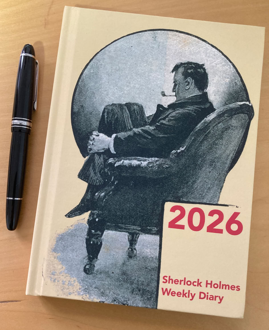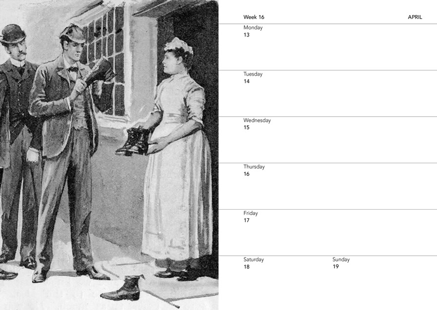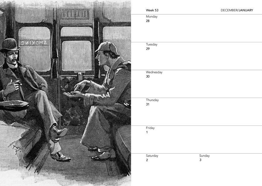 Hardback, A5 sized, this diary features the whole week on one right-hand page with full-page illustrations from the first printings of the Sherlock Holmes stories on each left-hand page.